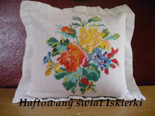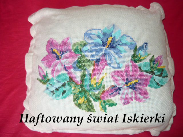 Dla zabicia tej nudy chwyciłam za igłę i wyhaftowalam trzy wzory kwiatowe, które przeznaczyłam na poszewki do zakupionych gdzieś za bezcen poduszeczek.