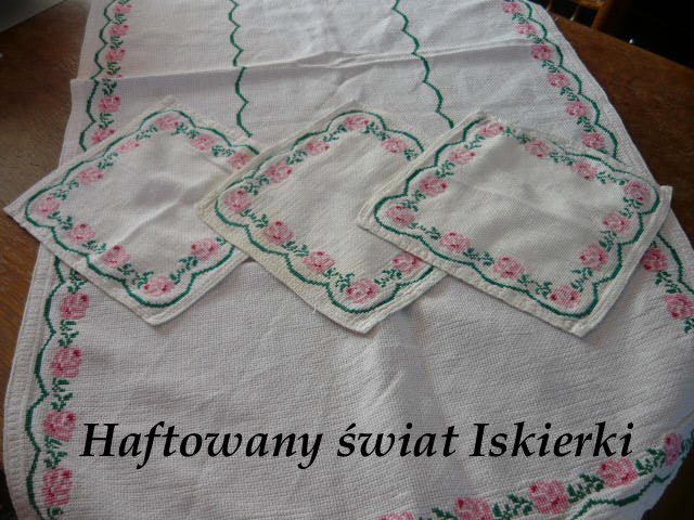 Haftowanie obrusa zajęło mi strasznie dużo czasu. Bardzo czesto więc robótka lądowała w kącie. Żeby jednak było widac efekty pracy postanowiłam dorobić pasujące do kompletu serwetki.