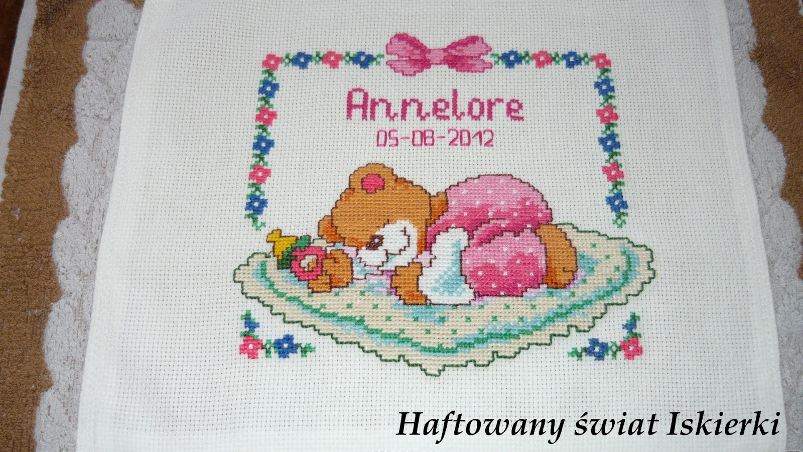 Na domiar złego okazało się, że pomyliłam się haftując ten kocyk na którym śpi misiu… Gdzieś przy tylnej łapce w zielonym wzorku dodałam o jeden krzyżyk za dużo i przy haftowaniu kremowego tła kocyka okazało się, że nie zgadzają mi się krzyżyki na końcach kocyka. Musiałam dodać w każdym rzędzie po krzyżyku na skutek czego kocyk strasznie się wydłużył. Później gdy zaczęłam według wzoru haftowac dolne kwiatki okazało się, że nie zgadzają się one z górnym obramowaniem…