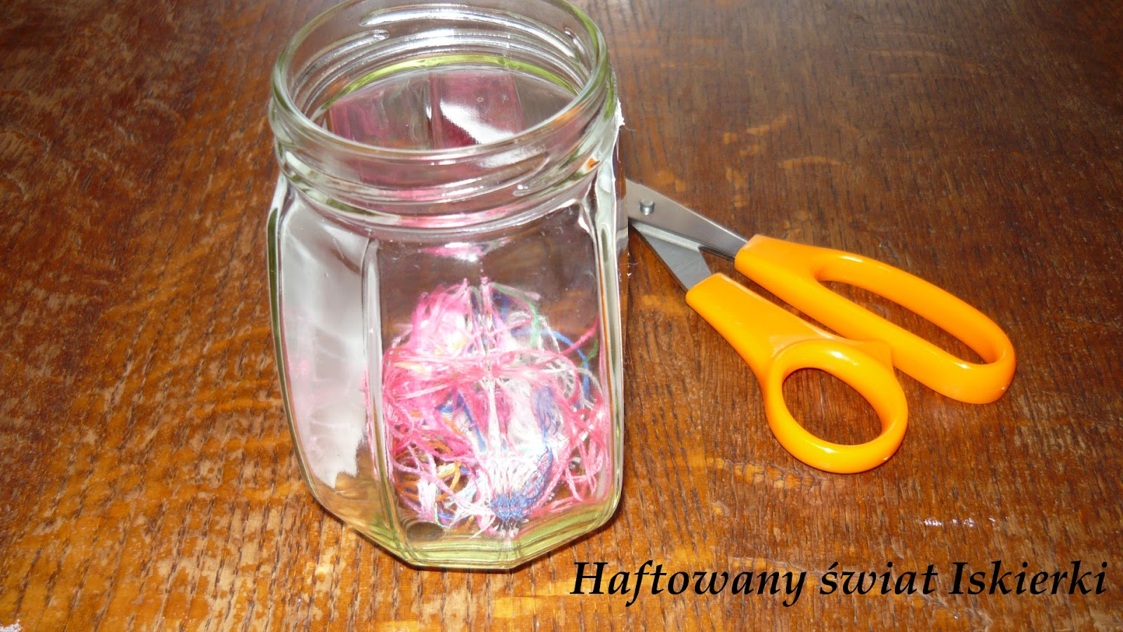 Muszę wam jeszcze podziękować za inspiracje dotyczącą resztek nici… Od lat miałam proble, co robić z resztkami ucinanych w trakcie haftowania nitek. Walały się po stole, po popielniczce, czasem spadały na podłogę. Przeglądając wasze blogi zobaczyłam coś, co bardzo przypadło mi do gustu – TUSAL-owy słoiczek.