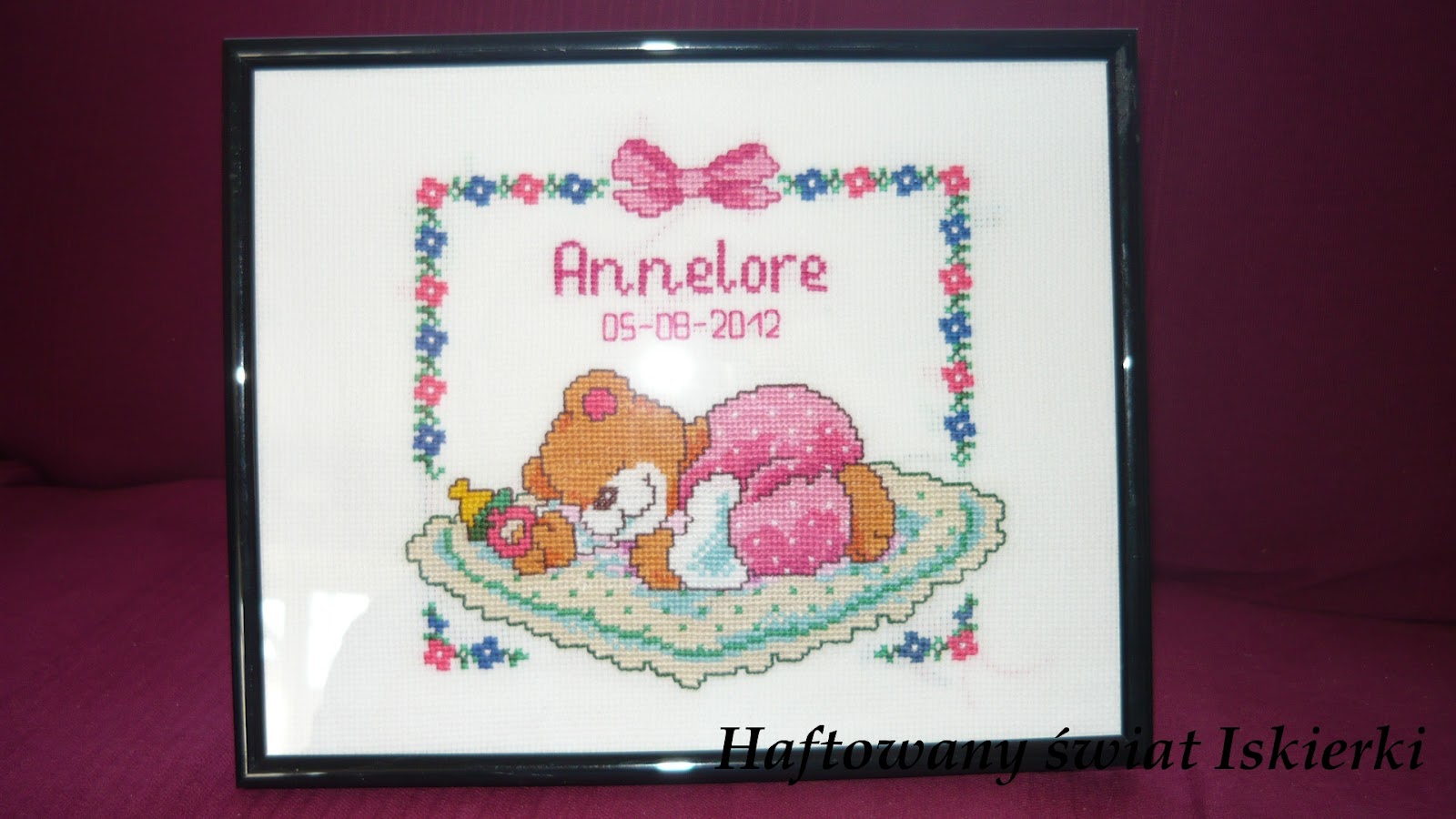 Miałam wyhaftować metryczkę dla nauczycielki mojego syna. Preosil  nie o to, bo bardzo ją lubił, a urodziła jej się wnusia. Pomyslałam – czemu nie? I tak zaczęła się moja katorga…