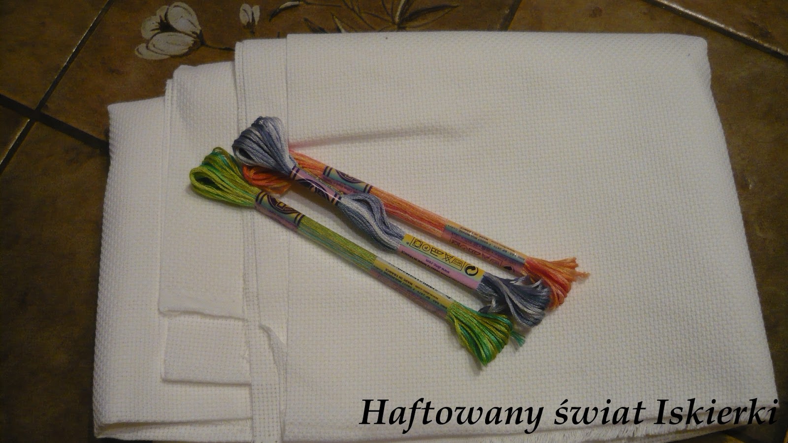 Teraz muszę się pochwalić prezentem. Od Renaty dostałam całe mnóstwo białej kanwy 14 i takie oto sliczne cieniowane mulinki: