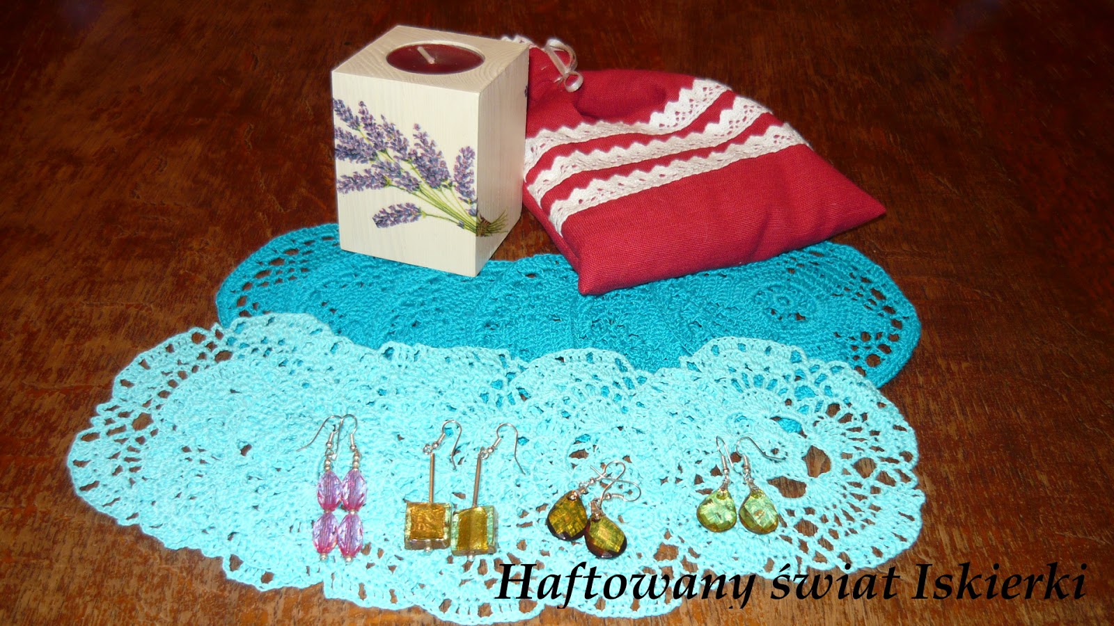 Co dostałam? Same cuda….. Dwa komplety pieknie wykrochmalonych szydełkowych podkładek pod szklanki w ulubionych przeze mnie turkusowych kolorach (jasnym i ciemnym), woreczek pełen pachnącej lawendy, decoupażowy świecznik na teelighty z motywem lawendy i lawendowym teelightem oraz cztery pary przecudnych kolczyków.