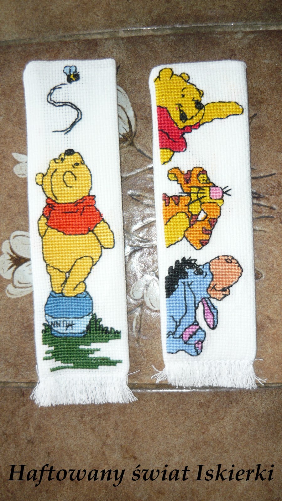 Na początek zakładki. Muszę się przyznać, że nie wyrobiłam się na czas z zamówieniem. I to nie dlatego, że były jakoś szczególnie trudne… Owszem, po raz pierwszy w swoim życiu haftowalam półkrzyżyki i musialam kombinować jak podzielić pole na dwa-trzy kolory. Na szczęście się udało i zakładki prezentują się tak: