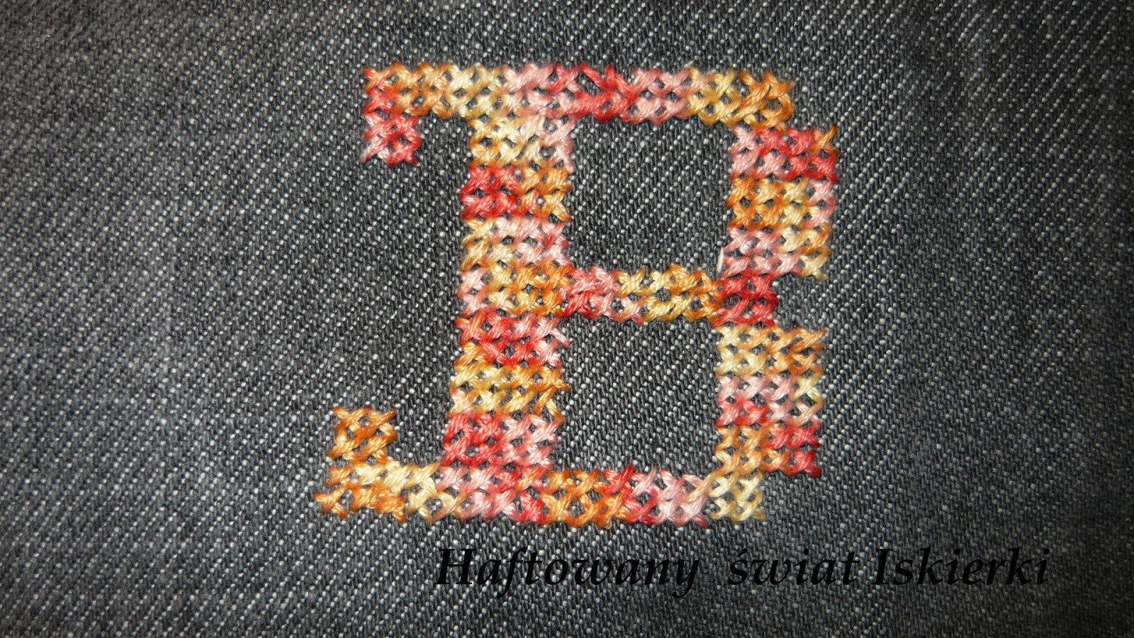 B jak Beata – pierwszy haft wykonany na przyszytej do materiału rzadkiej kanwie. Niestety widać że krzyzyki nie są idealne, w dodatku jest jeden błąd, ale… nie chce mi się go już poprawiać….
