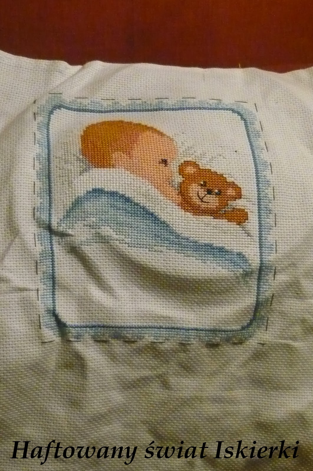 Tzn prawie skończyłam, bo brakuje imienia i daty jego urodzin, ale…. w tym roku do znajomej już nie pójdę w odwiedziny więc to może poczekać. Teraz mam zlecenie na podusie ze śpiącym misiem i MUSZĘ ją w końcu zacząć. A jak na razie to mam… sfastrygowaną kanwę i nałożony tamborek 😉