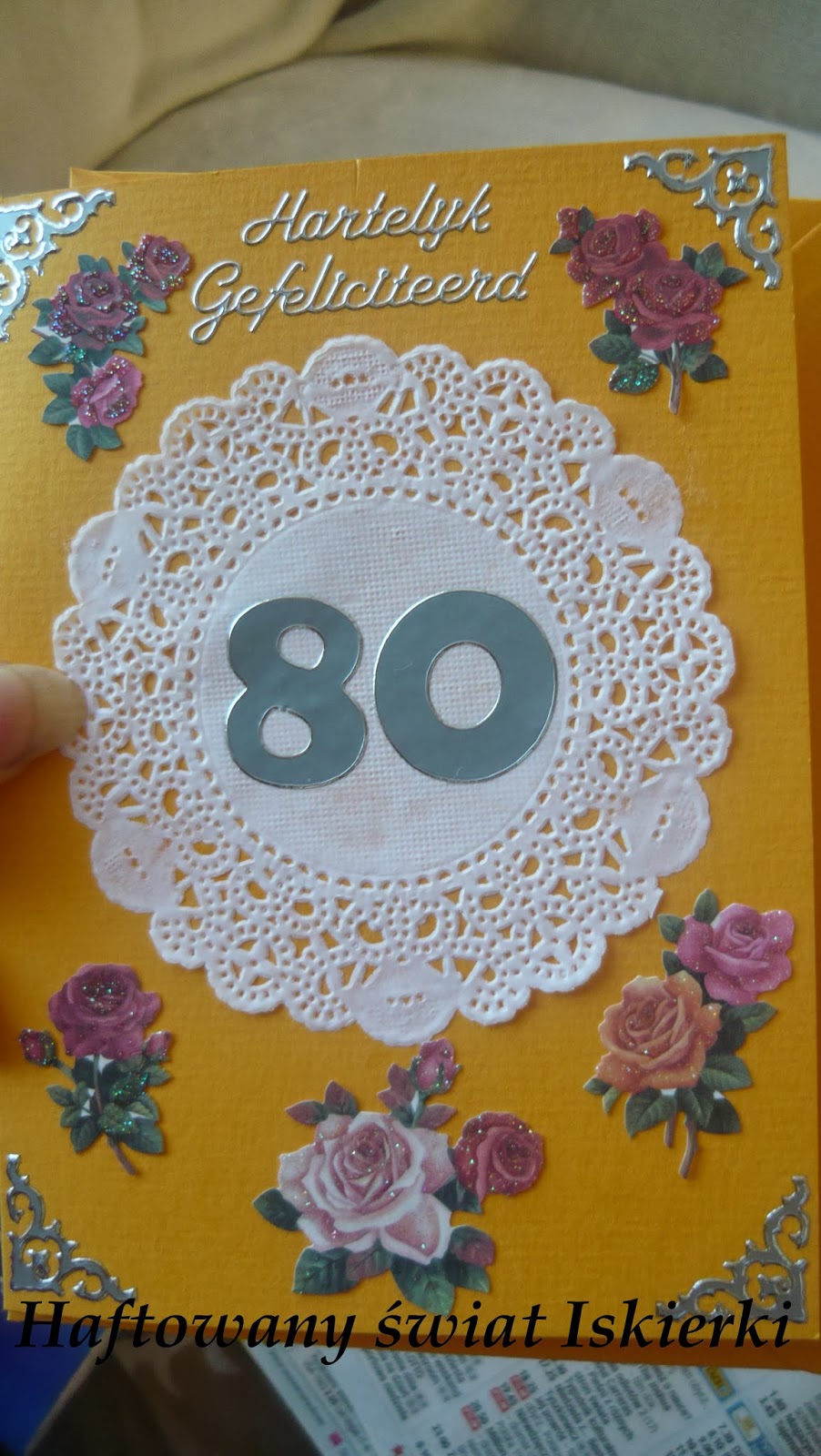 Dzisiaj mogę pochwalić się kartką urodzinową, jaką zrobiłam dla naszej sąsiadki zza ściany, która w ubiegłą sobotę skończyła 80 lat.