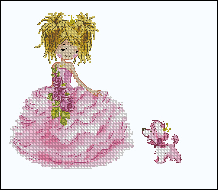 Księżniczkę zaczęłam haftować gdzieś pod koniec. Już pierwszego dnia po wyhaftowaniu dwoma kolorami sporego kawałka sukni dotarło do mnie, że coś jest nie tak… Odkryłam, że posiadany schemat nie pokrywa się ze zdjęciem, które wkleiłam wyżej.  Co więcej – w komputerze miałam inne zdjęcie Różowej Księżniczki, które też nie przypominało tego z oryginału…