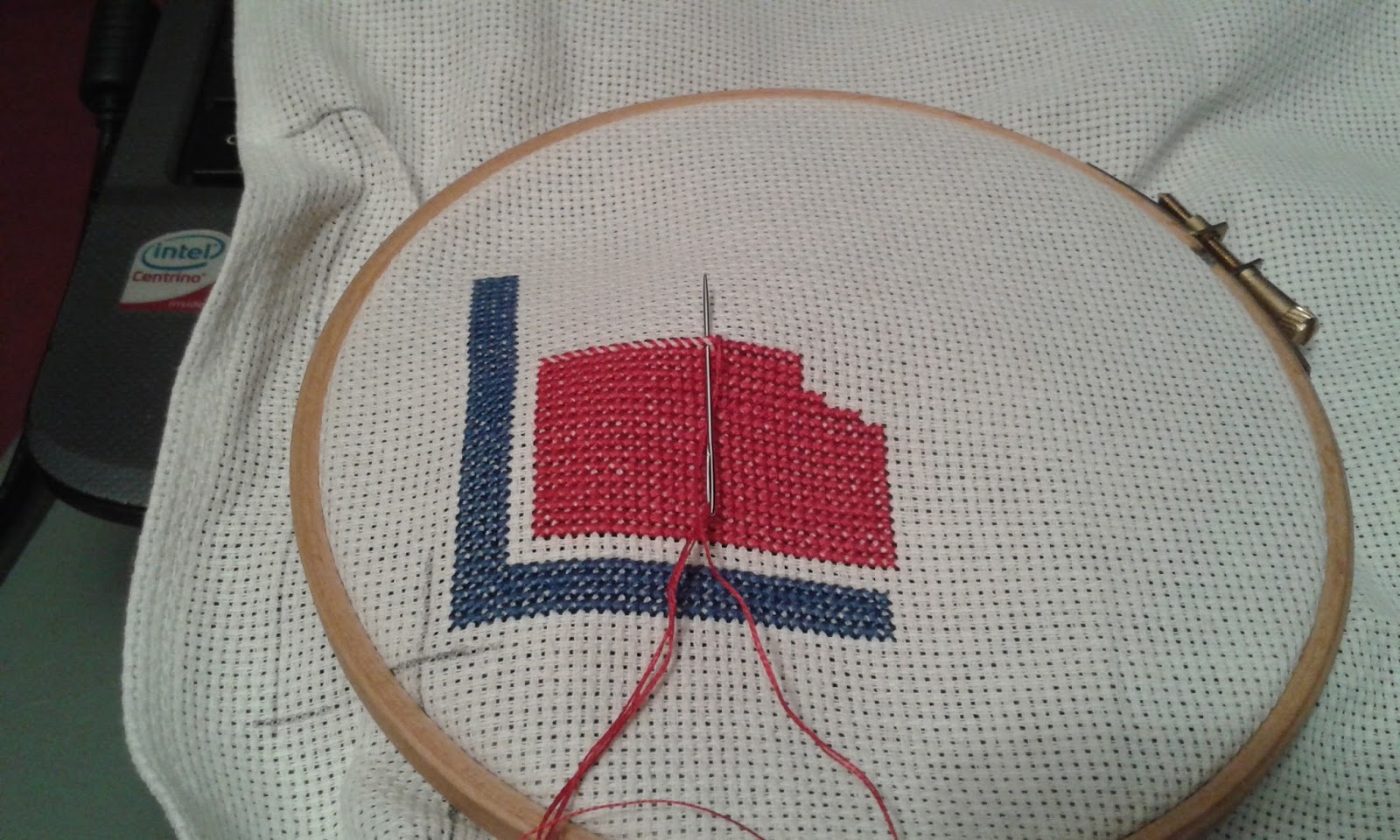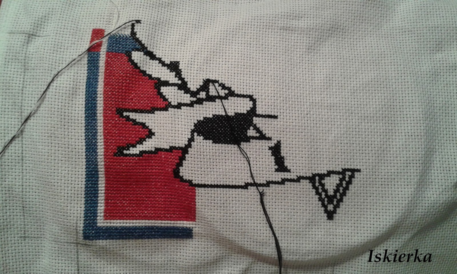 Na początek trzeba było znaleźć odpowiedni motyw do haftowania, a potem „przerobić” go na wzór graficzny. Już na tym etapie pojawiły się schody, bo żaden program konwertujący nie mógł zrozumieć, że obraz może mieć wyłącznie 4 kolory – biały, czerwony, niebieski i czarny. Żadnych cieni, półcieni itp.