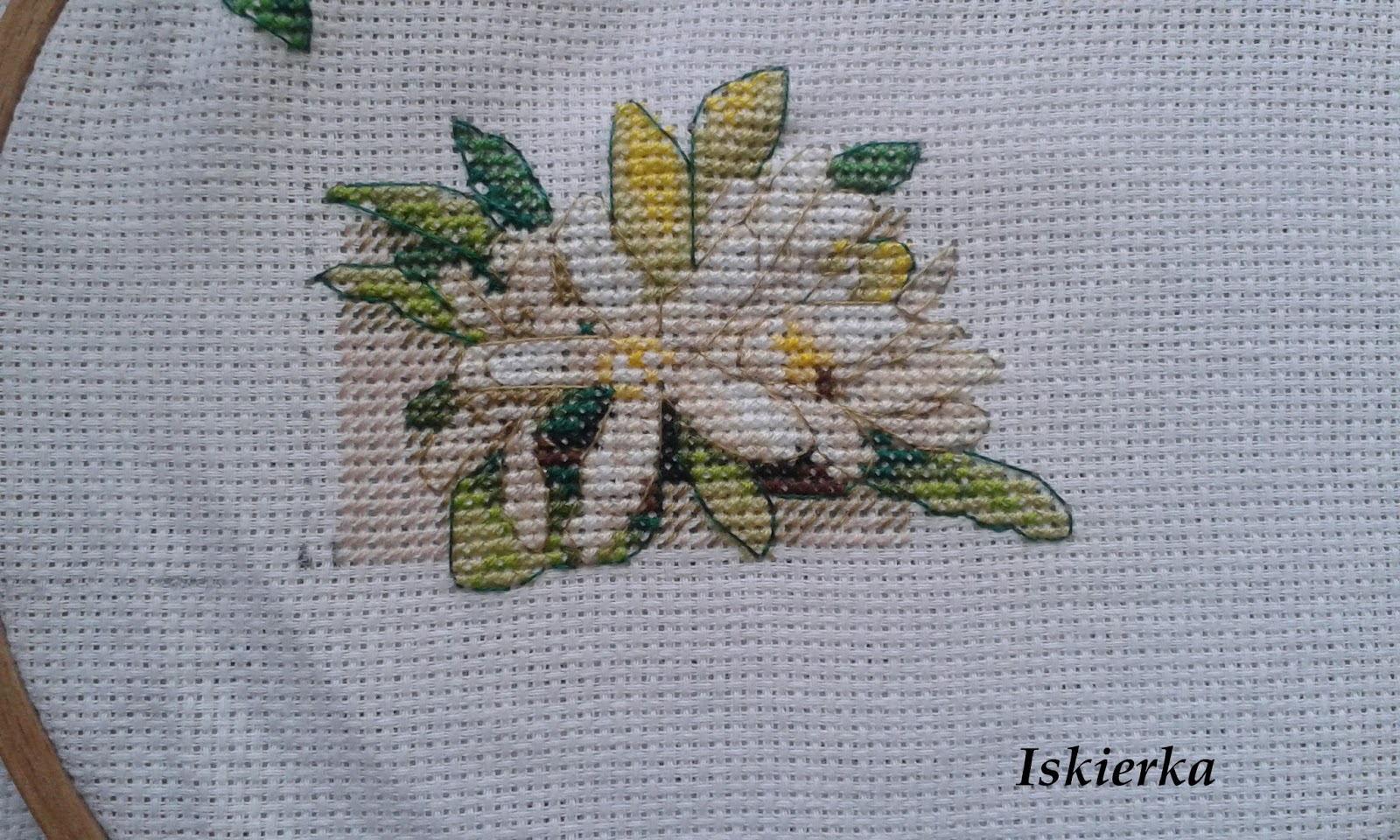 Przez weekend zrobiłam też Kwiat Pomarańczy na kanwie cytrusowej, ale niestety zabrakło mi muliny na zrobienie napisu.