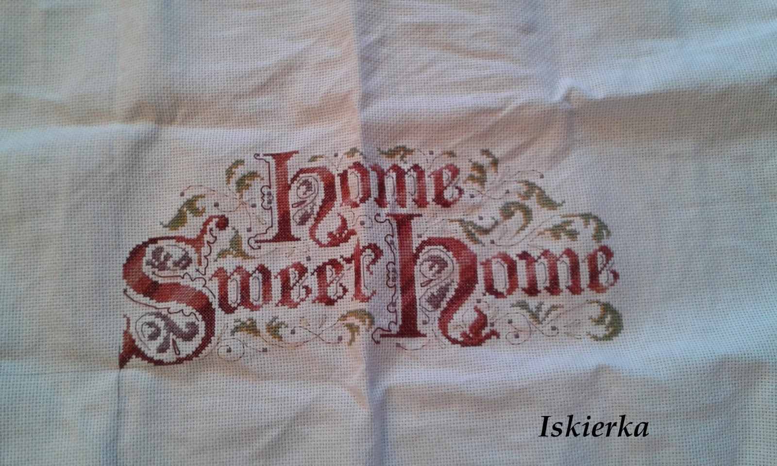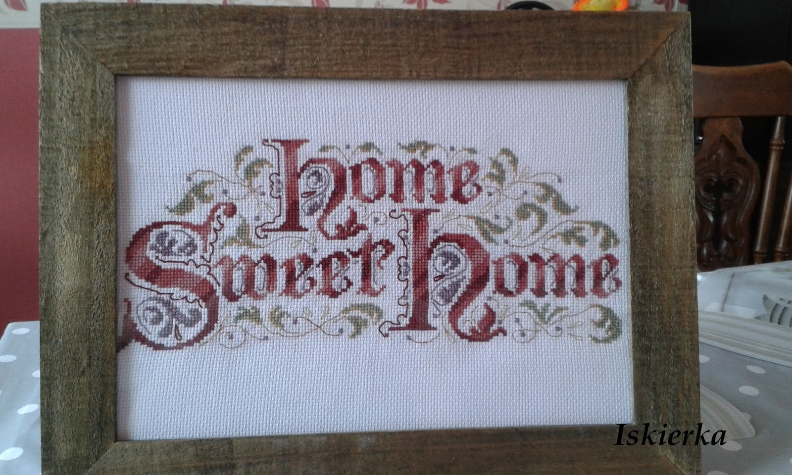 W lutym br mój młodszy brat wraz ze swoja dziewczyną wynajęli sobie małe mieszkanko. W sumie to nie byłam tam jeszcze („trochę” to daleko – jakieś 1200 km), ale stwierdziłam, że wypadałoby dać im coś na to nowe mieszkanko by mieszkało im sie fajniej, przytulniej. A że nie przemawiają do mnie prezenty typu garnki, szklanki, sztućce czy inne „kuchenne bibeloty” made in China/Japan/Korea (do wyboru) postanowiłam dać im coś od serca, czyli własnoręcznie wyhaftowanego. Wybór padł na znany już wzorek: