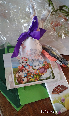 Takie wspaniałości dostałam od Oli z bloga Realizacja Marzeń – pięknego pachnącego królisia, którego Ola sama uszyła (na jej blogu znajdziecie tych królisiów więcej), karteczkę świąteczną z pięknymi życzeniami, bazy do kartek z kopertami, mulinę, czyli coś, co hafciarki kochają najbardziej, czekoladę i obłędnie pachnący balsam do ciała… Czuję się niesamowicie dopieszczona i szczęśliwa…