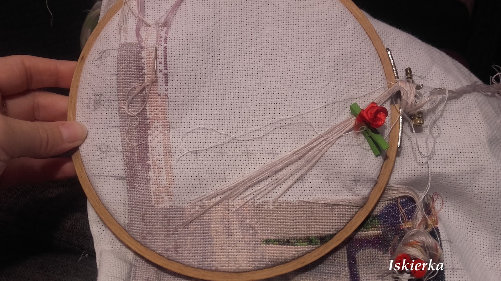 W zeszły czwartek po wiadomym telefonie ze szpitala nie mogąc skupić się na literkach do ślubnego wzoru postanowiłam wreszcie wrócić do Tego obrazu. Wymieniłam więc muliny w pudełku po herbacie, wydrukowałam sobie kolejne 2 strony i zasiadłam wygodnie w moim „centrum dowodzenia