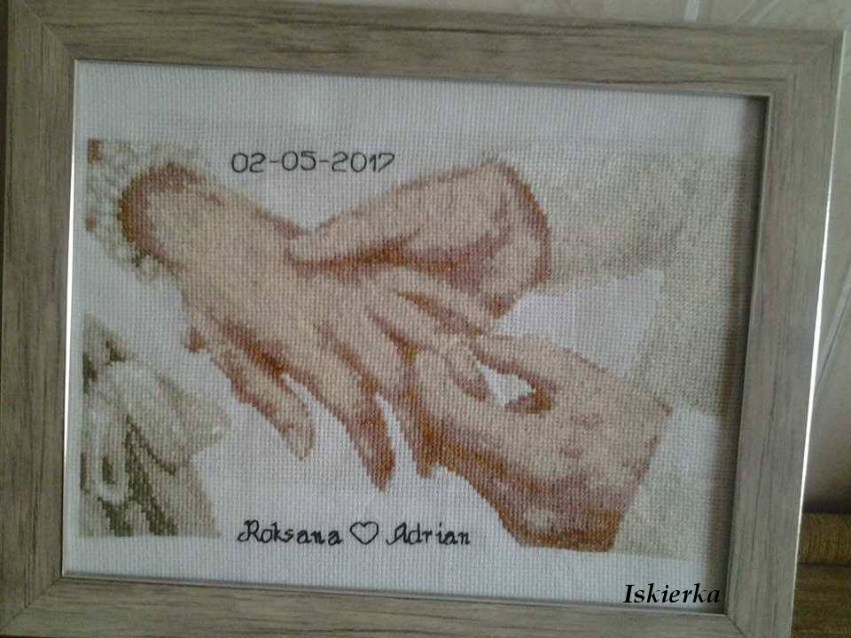 A czym jeszcze zapomniałam się pochwalić? Właśnie. Nie wiem czy pamiętacie (pewnie nie, więc wam przypomnę), że w sierpniu 2016 chwaliłam się zaczętą pamiątką ślubną na zamówienie szwagierki. Początek pokazywałam TUTAJ. Haftowanie zajęło mi prawie tydzień. Obrazek został wyprany, wyprasowany i wysłany do Polski, a ja zajęta haftowaniem Tęczowej Róży i pamiątki ślubu dla chrześnicy zapomniałam się nim pochwalić: