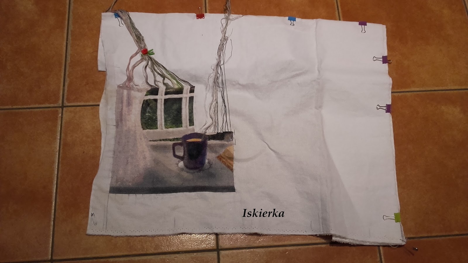 Powiem, że dość fajnie mi się tym razem haftowało pomimo pikselozy parapetu. Ciekawe, jak pójdzie dalej, bo dalej będzie… rama okna i duuuuuużo zieleni (czyli znów pikseloza)
