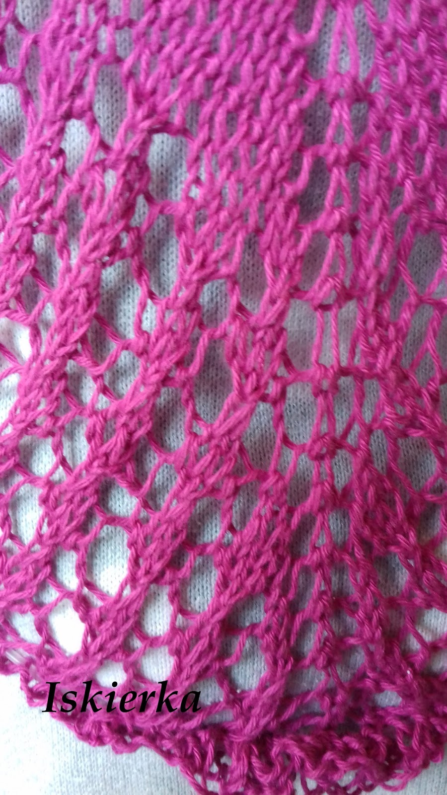 W końcu sprułam cały ażur i zaczęłam powoli jeszcze raz. I znów ta sama historia – do oczka środkowego jest idealnie a po nim jakoś nie może mi się zgrać. Zawsze na końcu przed ostatnimi oczkami brzegowymi okazywało się, że nie zgadza mi się liczba oczek do przerobienia z tą konkretną linijką schematu.\