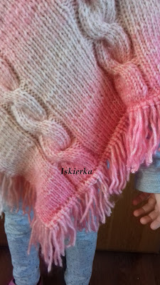 W miarę chciałam zrobić to zgodnie z odcieniami. Trochę mi się to udało. Niestety pod koniec poncza zabrakło włóczki… Popędziłam do sklepu i co? I ZONK – włóczki brak. Po 2-3 dniach takiego zaglądania na półkę znalazłam coś zupełnie innego, ale w miarę pasującego. Niestety tak mi zależało na skończeniu frędzli, że nie zdążyłam zrobić zdjęcia.