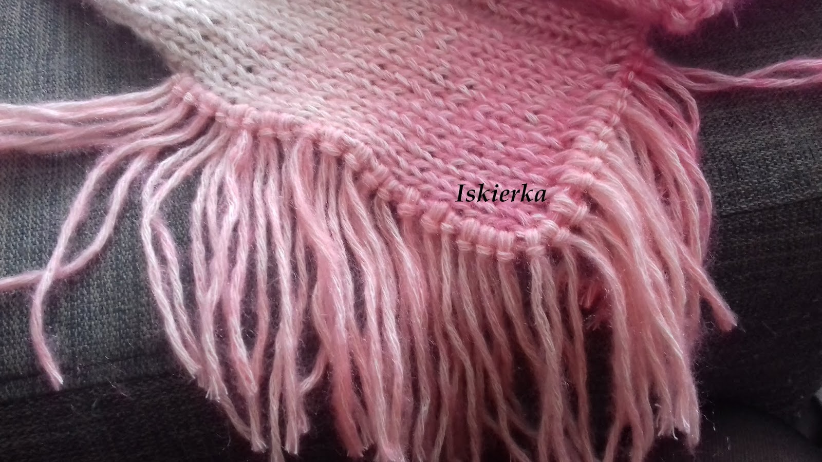 W miarę chciałam zrobić to zgodnie z odcieniami. Trochę mi się to udało. Niestety pod koniec poncza zabrakło włóczki… Popędziłam do sklepu i co? I ZONK – włóczki brak. Po 2-3 dniach takiego zaglądania na półkę znalazłam coś zupełnie innego, ale w miarę pasującego. Niestety tak mi zależało na skończeniu frędzli, że nie zdążyłam zrobić zdjęcia.