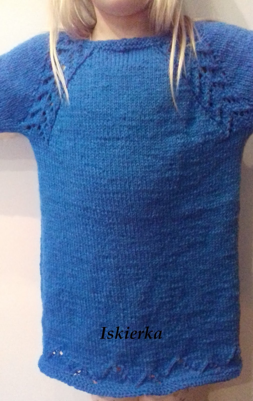 Wzór sweterka to Sweet Bay ze strony Dropsa. Oczywiście rozmiar też zdecydowanie zmniejszony, bo nie dość że moja córka jest bardzo szczupłą to pamiętałam lekcję z niebieską włóczką i nie poszerzałam już ani korpusu sweterka ani rękawów: