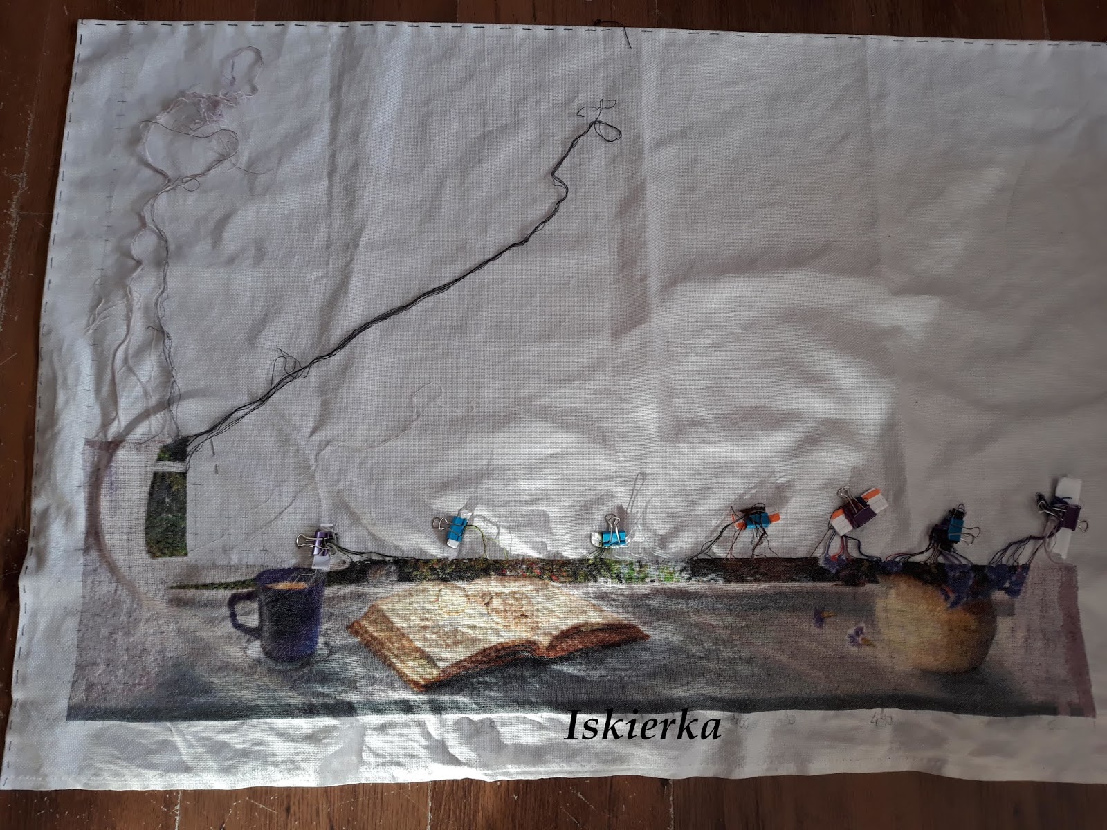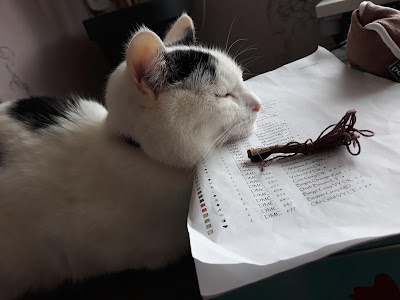 Pilnuje schematu i pudełka z mulinami… Nie, no przecież on nie przeszkadza… Przeszkadza za to fakt, ze jak zwykle tradycyjnie już zabrakło mi najbardziej w tym momencie potrzebnego koloru muliny. I jak zwykle tradycyjnie zamawiałam ją 3 tygodnie… Ale w końcu zamówiłam, powinna jutro przybyć.