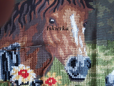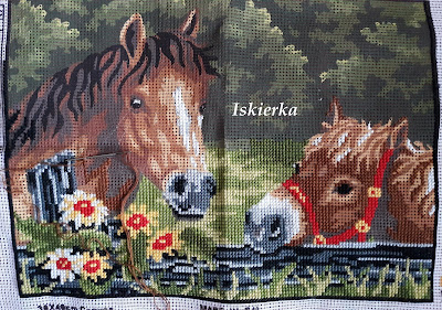 Jak już kiedyś pisałam, generalnie nie lubię takiej kanwy. W 99% wzór jest niedokładnie nadrukowany i czasem trzeba się nieźle nagłowić czy postawić jeszcze ten jeden krzyżyk, czy już sobie odpuścić. Z drugiej strony szkoda mi było wyrzucać tę kanwę, szczególnie że ktoś już się troszeczkę przy nim napracował, a córka stwierdziła, że jej się te koniki bardzo podobają…