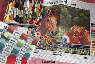 Dostałam zaczęty haft – kanwę z nadrukiem – piękne dwa koniki. Do kompletu była mulina DMC plus muliny z Action.