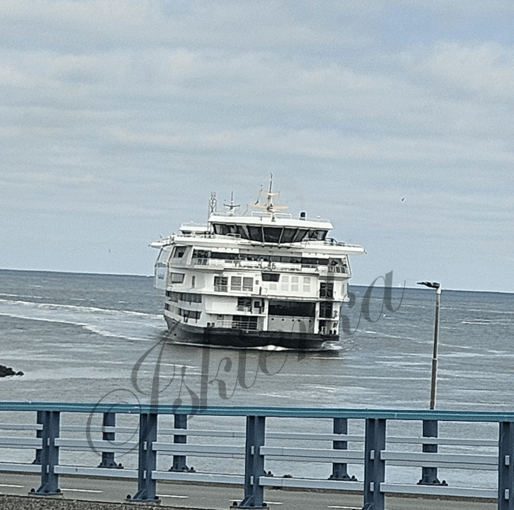 Duży prom pasażerski, dwa piętra ładowności samochodów wszelakich – osobowych i ciężarowych, pięć czy sześć długich pasów jezdni w środku każdego piętra plus dwa po bokach – takiej masy samochodów się nie spodziewałam.