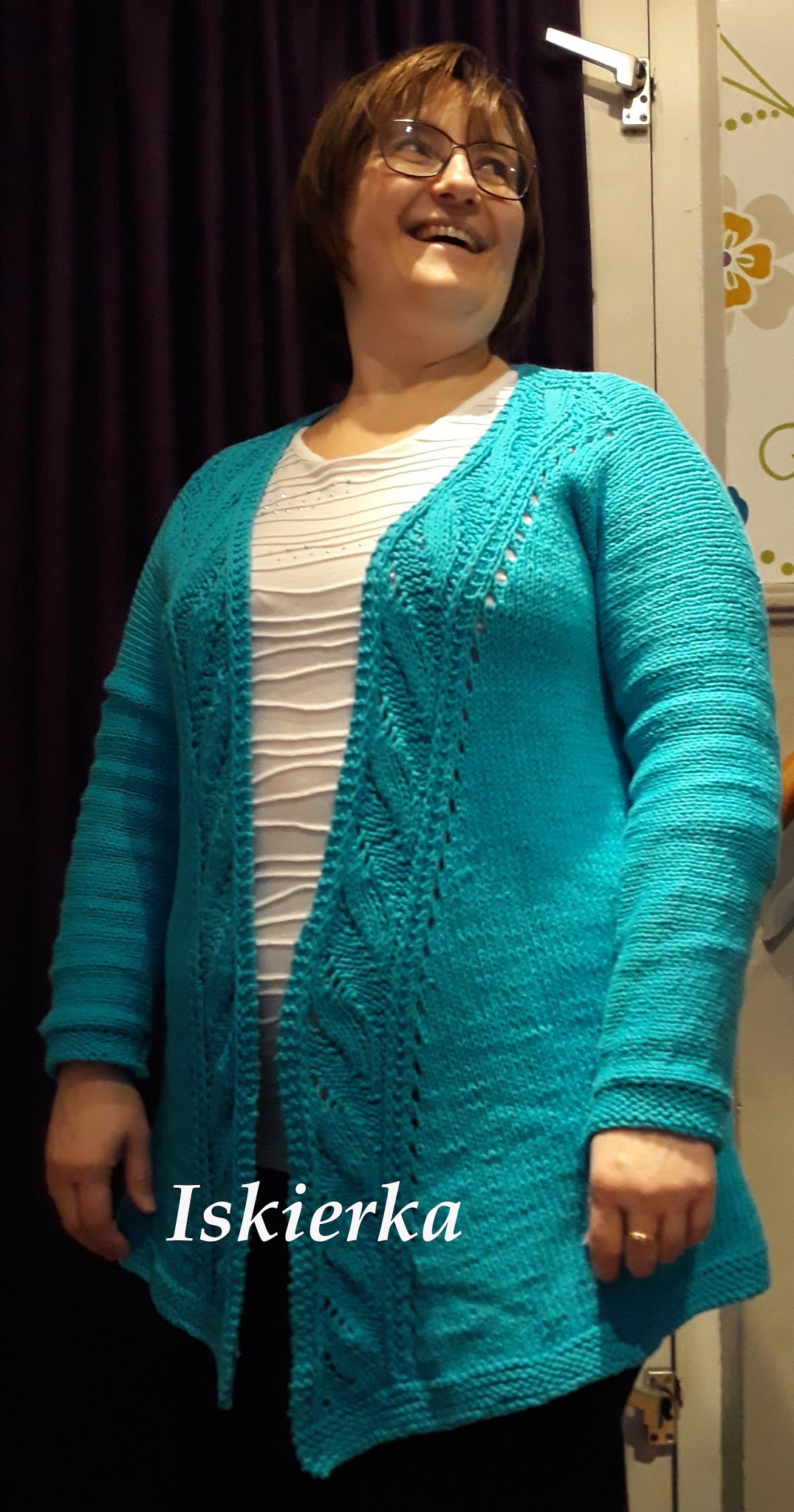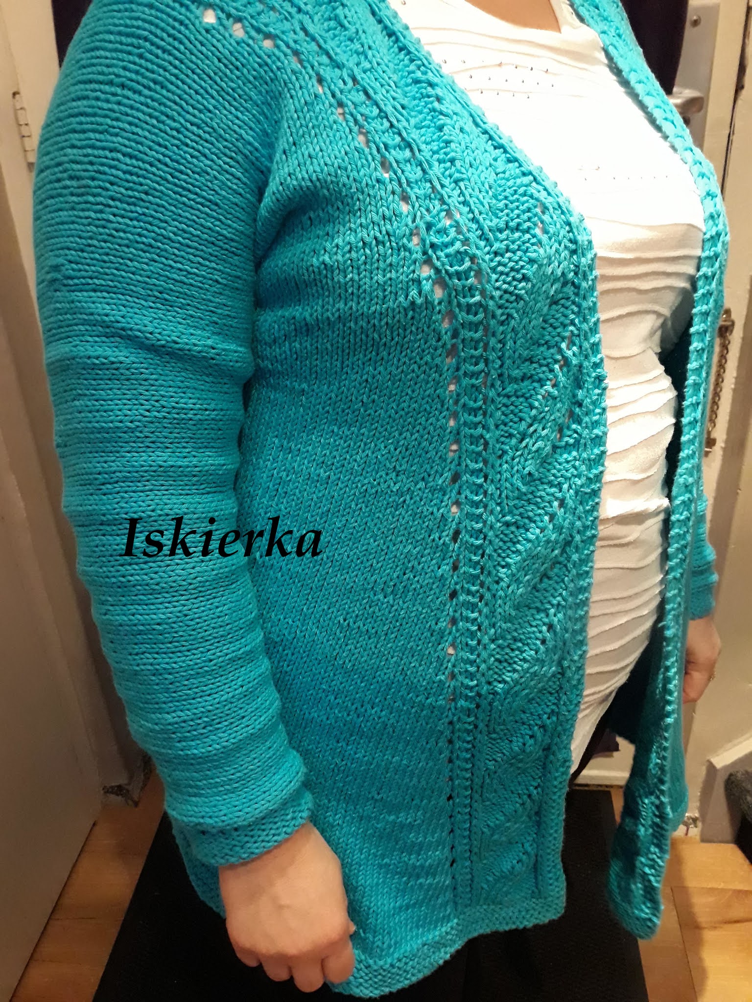 Sweterek „wisiał” tak sobie ze 3 czy 4 dni. A potem w końcu doczekał się zszywania, przymiarki i sesji zdjęciowej:Nie patrzcie proszę na tło zdjęcia. To jest jedyne miejsce w którym zdjęcia w miarę dobrze wychodzą. Nie ma mebli, tylko drzwi i tapeta…