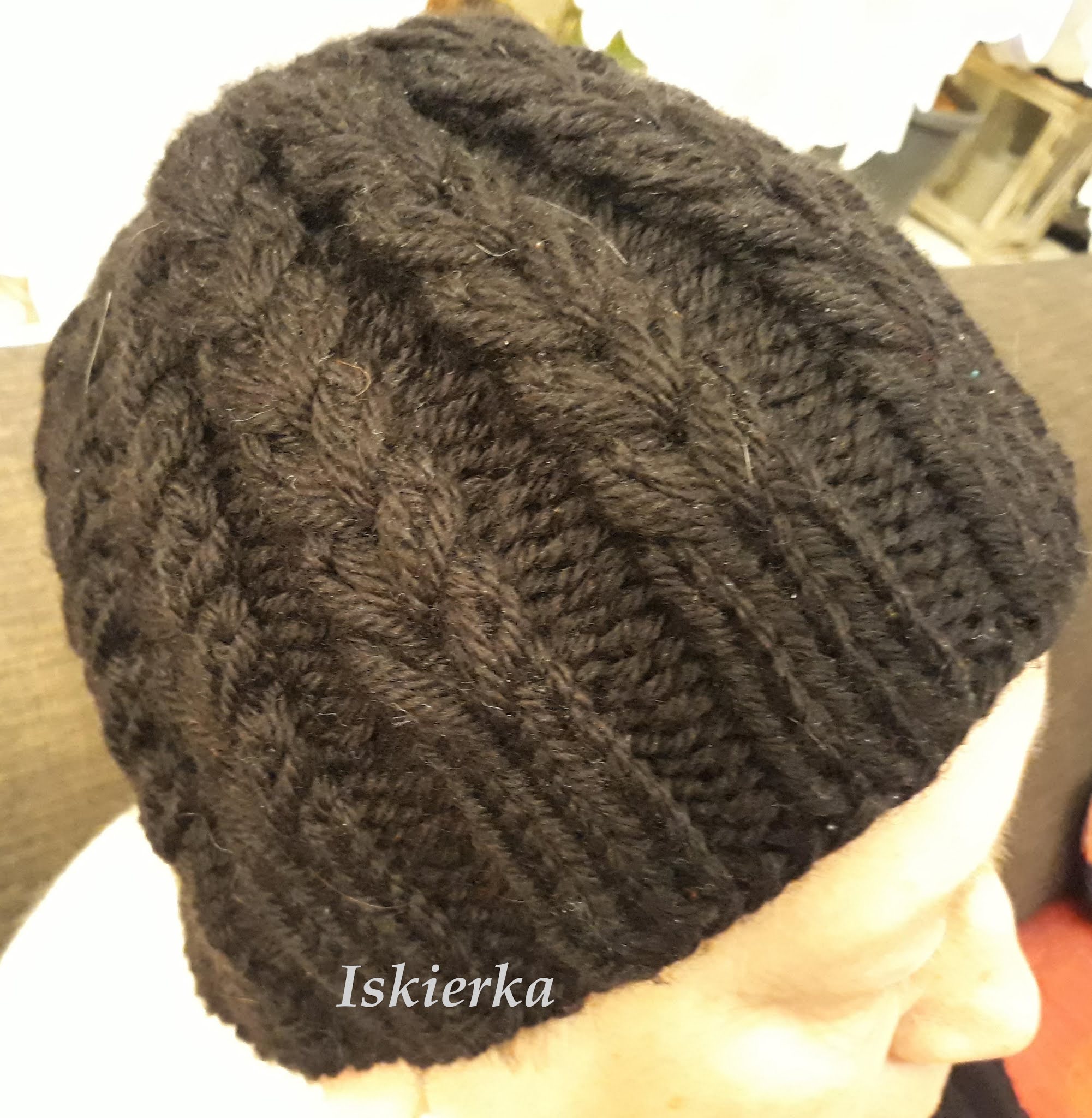 Po czasie powiedziała, że mnie przeprasza ale obie czapki podarowała swojej siostrze.I poprosiła, by zrobić jej jedną, czarną, najlepiej w kłosy. No to zrobiłam, tym razem a Drops Alaska podwójną nitką:Tym razem „modelka” była na miejscu więc po trylionie przymiarek zarówno wielkość obwodu jak i wysokość czapki została zaakceptowana.