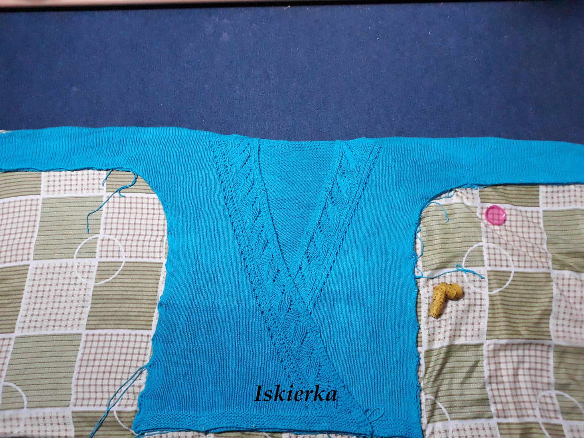 Ale jak już ogarnęłam chałupę po tych remontach co doszły do skutku czas było skończyć moje drutowe arcydzieło. I tak mój pierwszy w życiu własny zszywany sweter najpierw doczekał się blokowania: