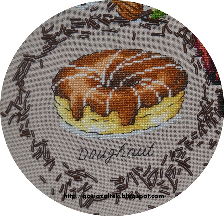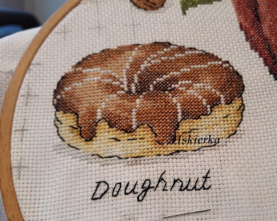 O ile całe ciastko haftowało się w miarę fajnie, to te białe „lukrowane” kreski to była makabra… Dwa niemal identyczne kolory – śnieżno biały i błękitny na białej kanwie niemal nie robią różnicy. Całkiem dobrze można by je było wyhaftować jednym kolorem, bo raczej nikt by się nie zorientował…