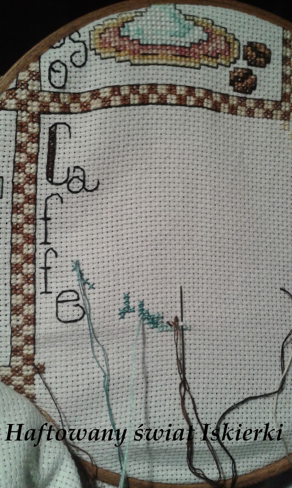 W bólach rodziła się kolejna, sierpniowa już kawa:Niby nic skomplikowanego, ale w czasie jej haftowania walnęłam tyle błędów, że aż wstyd… Na domiar złego skończył mi się jeden kolor, a do pasmanterii mi jakoś nie po drodze…