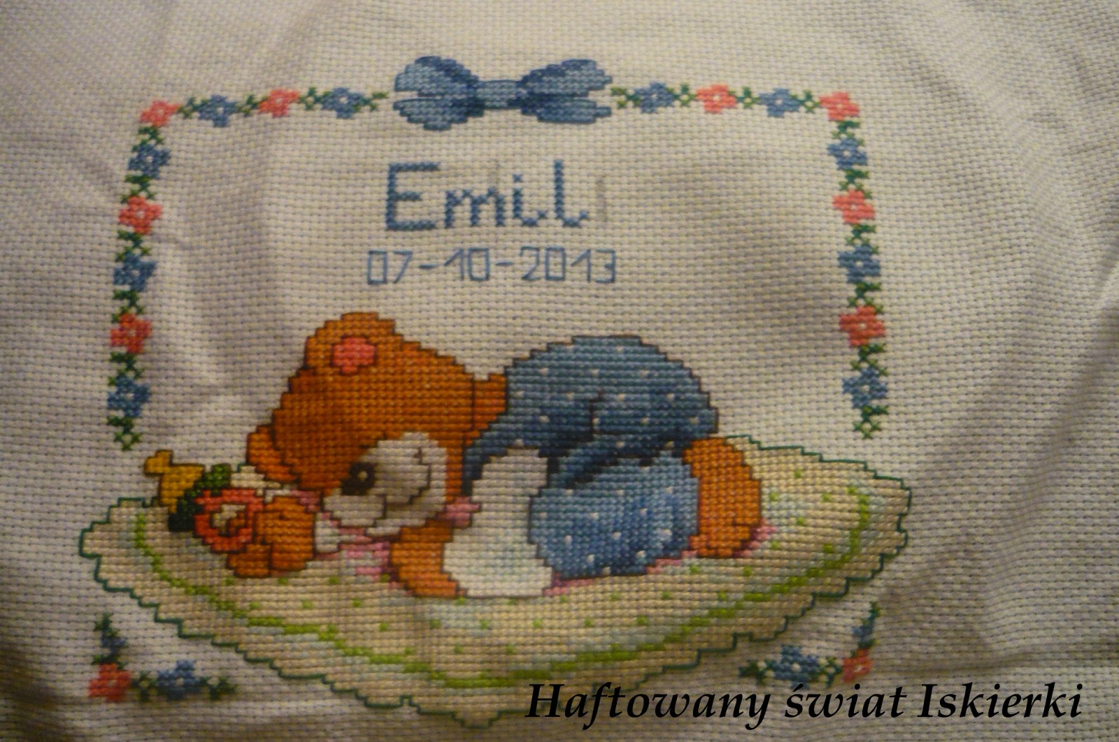 Dla małego Emilka haftowałam misia na podusię. Miś już jest gotowy: