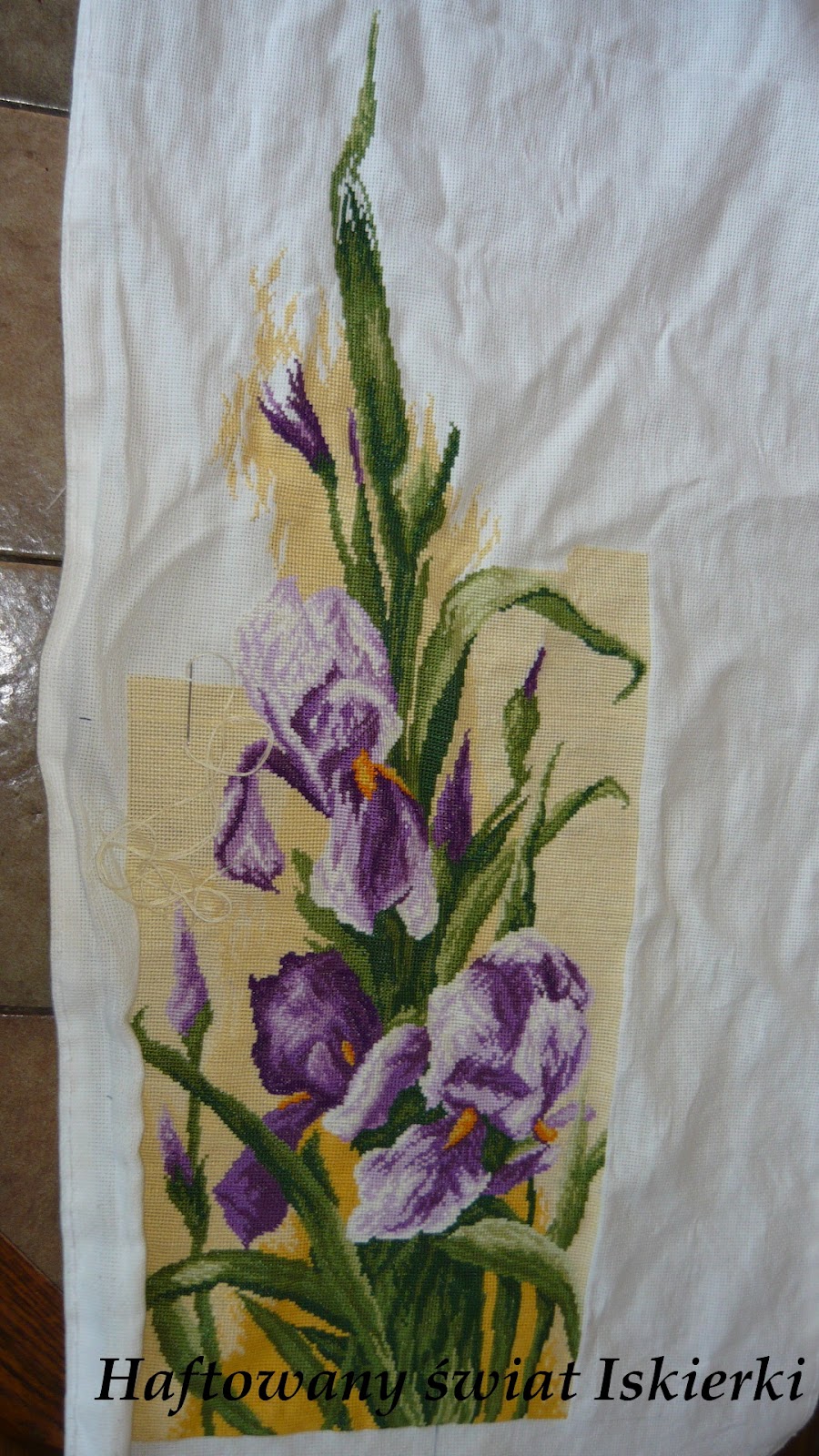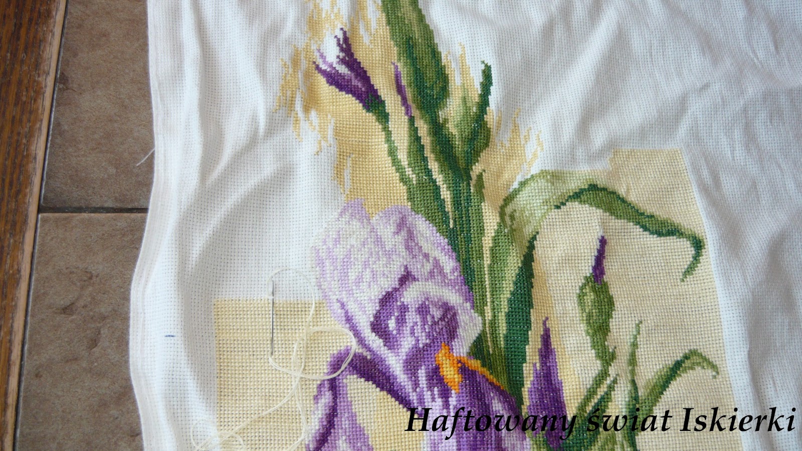 Po breloczkach wypadało zabrać się za dalsze wyszywanie moich irysów. Wbrew pozorom idzie dość szybko, tym bardziej, że został mi do wyszycia jeden duży kwiat i żółte tło.